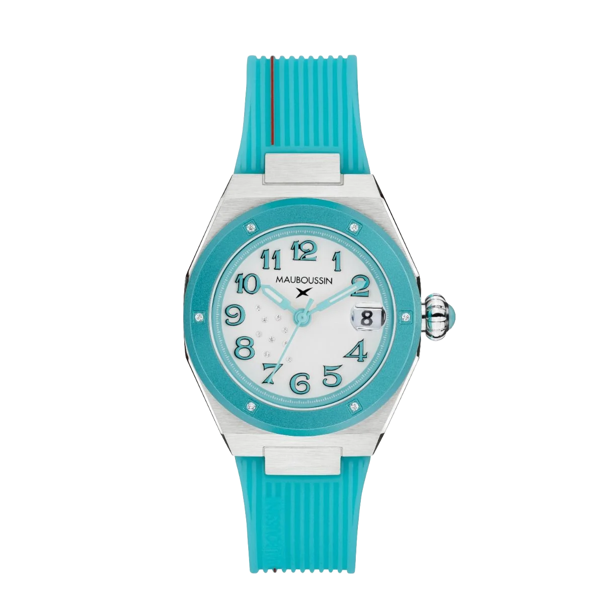 - Crown: Steel with synthetic turquoise spinel