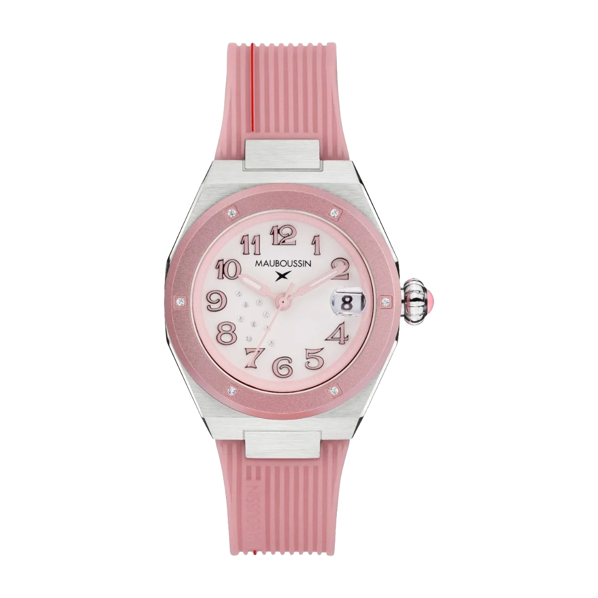 - Crown: Steel with synthetic pink spinel