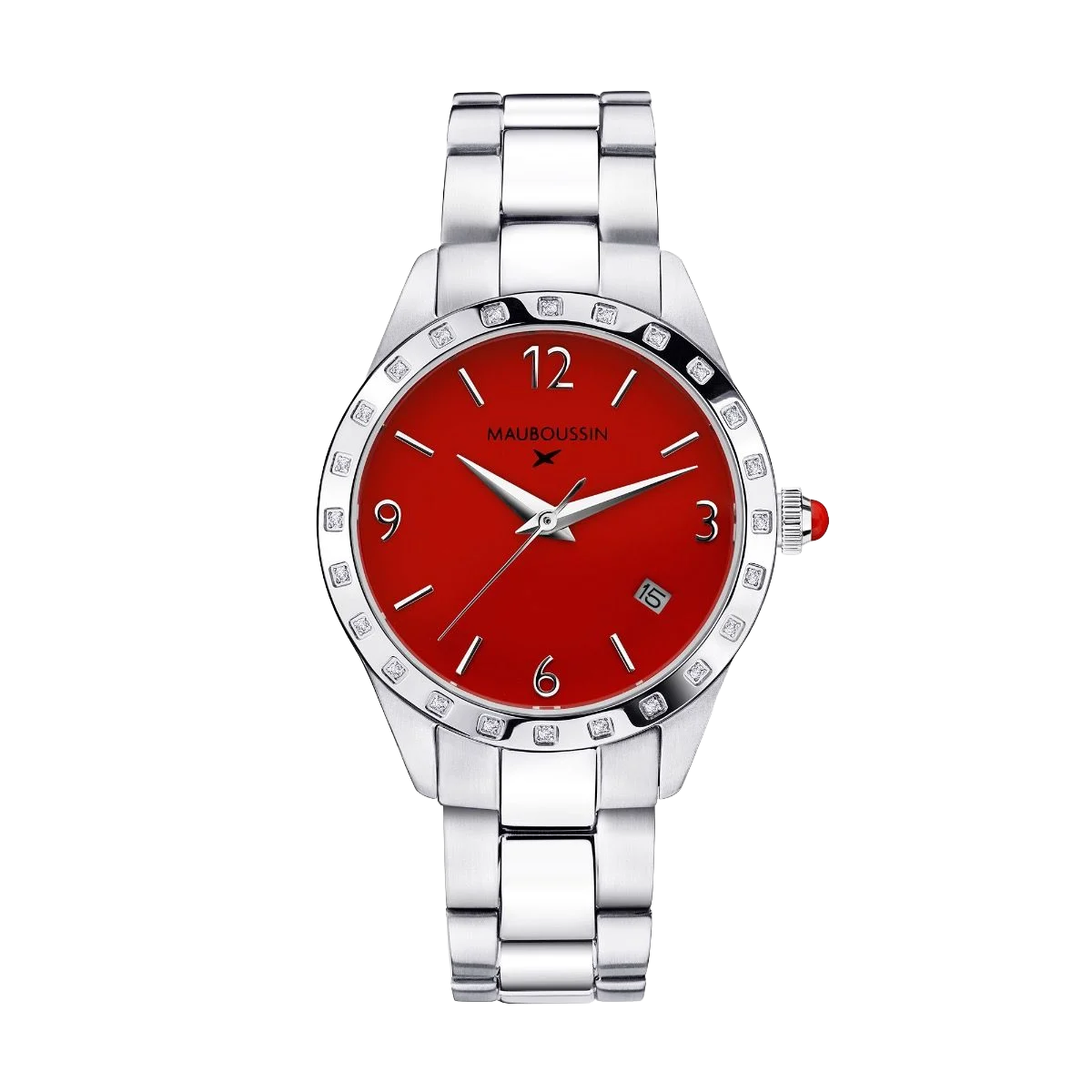 Il est Grand Temps watch, steel, red dial, diamonds, steel bracelet