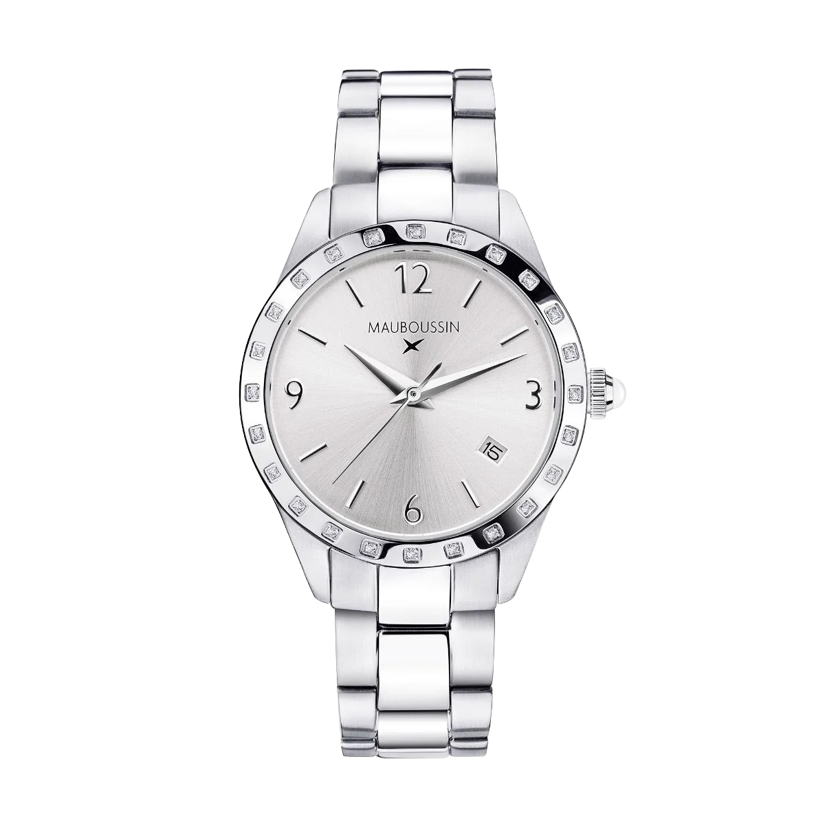 Il est Grand Temps watch, steel, silver sunray dial, diamonds, steel bracelet